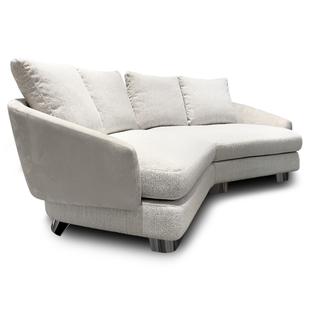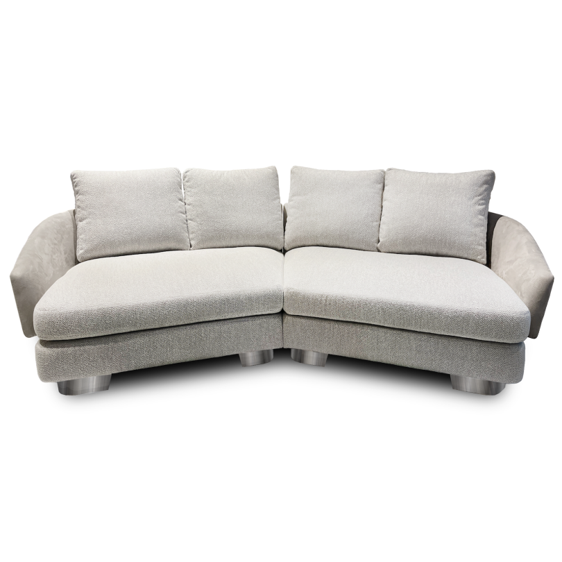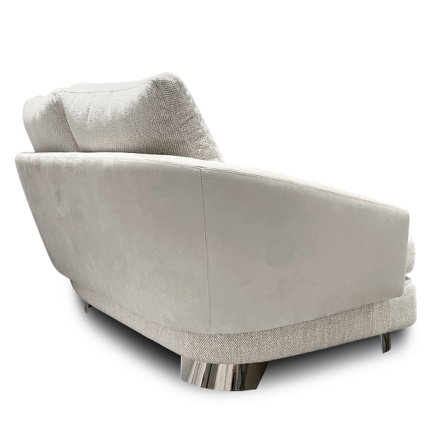 WEI-WEI three seater sofa, as shown, the curved sofa design combines various materials for a stylish aesthetic. The backrest is crafted from high quality synthetic leather, while the seating features light grey fabric upholstery. Completing the look, the sofa base showcases a shiny chrome finish for added elegance.