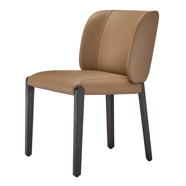 UNI-UNI Chair, as shown, features a white fabric upholstery accompanied by solid ash wood legs. Its back exhibits a subtle curvature on both sides, providing a wrapped and supported structure. The product is also available in other fabric, colour, synthetic leather or top grain leather.