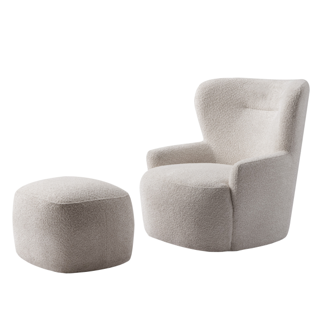 SOV-SOV Chair , as shown, features an integrated footrest that extends its visual flow. The matching angled legs create rhythmic geometry, while the tailored upholstery completes this harmonious blend of comfort and contemporary design.