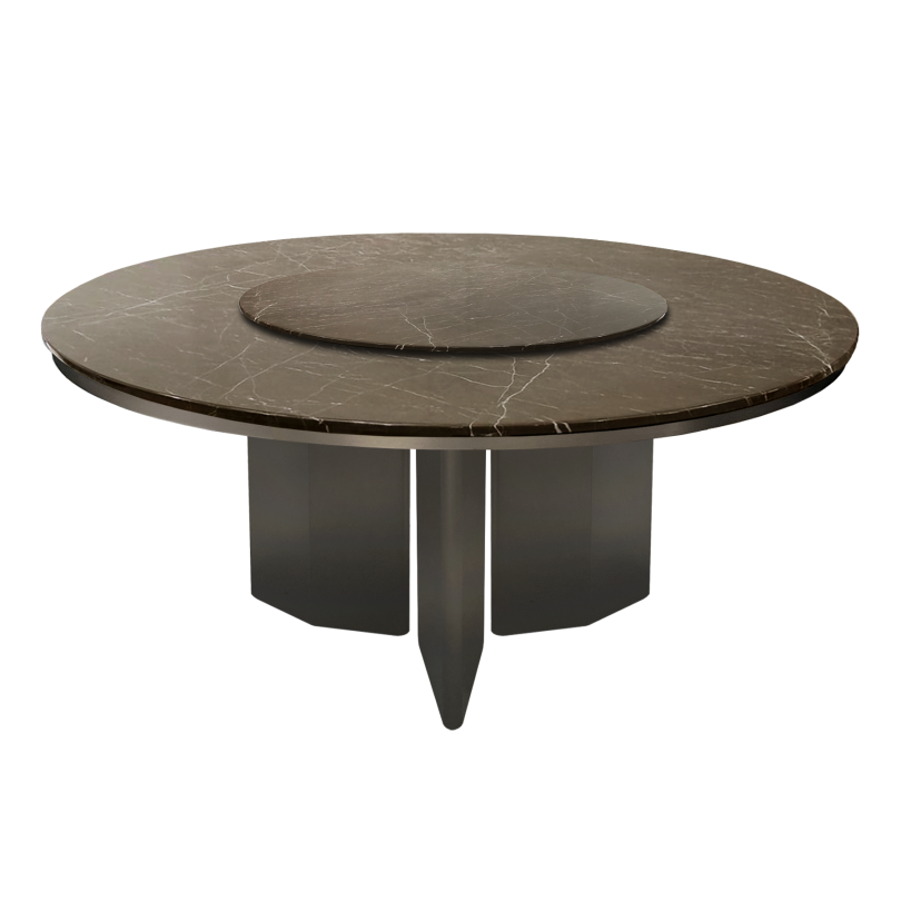 DOM-DOM dining table, featuring a stunning pietra brown marble top that beautifully showcases its natural allure. The table is supported by a base composed of three elegantly shaped gun metal legs, which add a touch of sophistication. Available in other marbles, colours and sizes.