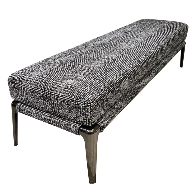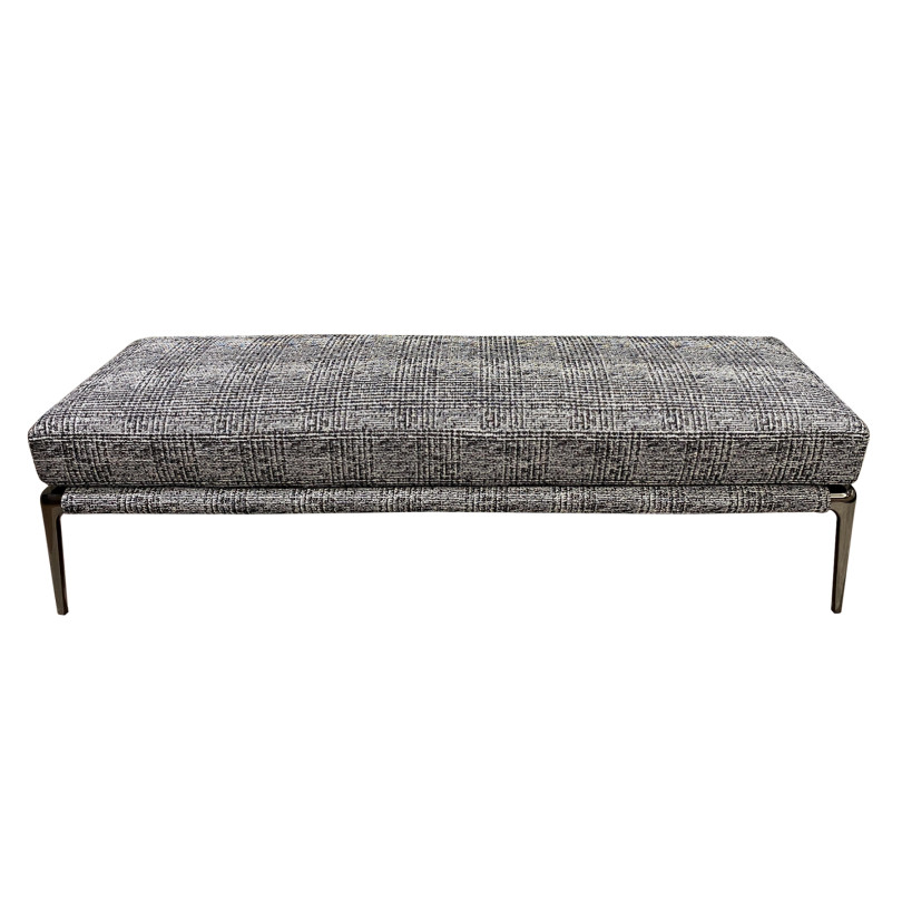 OBI-OBI bench, as shown, is features with fabric upholstery and supported by sleek metal legs. This particular bench is also offered in various fabric options, colours, as well as top grain leather and nubuck leather.