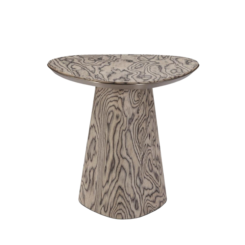 KET-KET Table, as shown, features a refined wood veneer surface complemented by brushed nickel stainless steel edges. Its sleek design and versatile sizes make it a perfect addition to any living space, enhancing both functionality and elegance for everyday gatherings or cozy evenings.