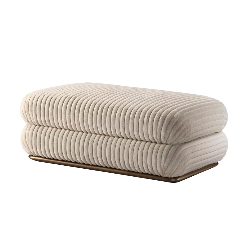 The WYN-WYN bench, as shown, is a great addition to any interior. It has fabric upholstery and a solid wood base with a brushed brass finish.