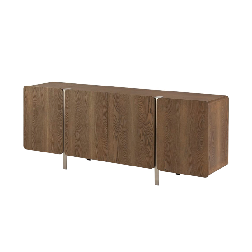 RID-RID sideboard, as shown, is made with walnut wood veneer and has a modern design. It has four door panels and stylish details, including brushed nickel stainless steel legs.