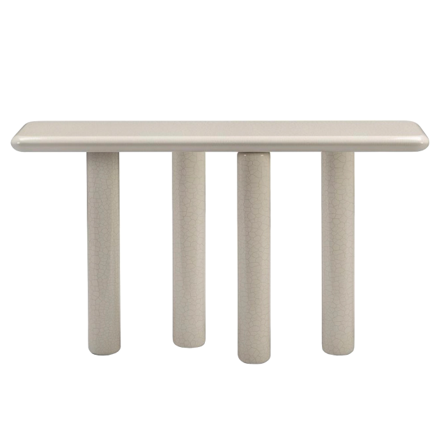 KEY-KEY console, as shown, crafted with a white painted finish and features rounded edges. It is made of engineered wood and a set of four legs.