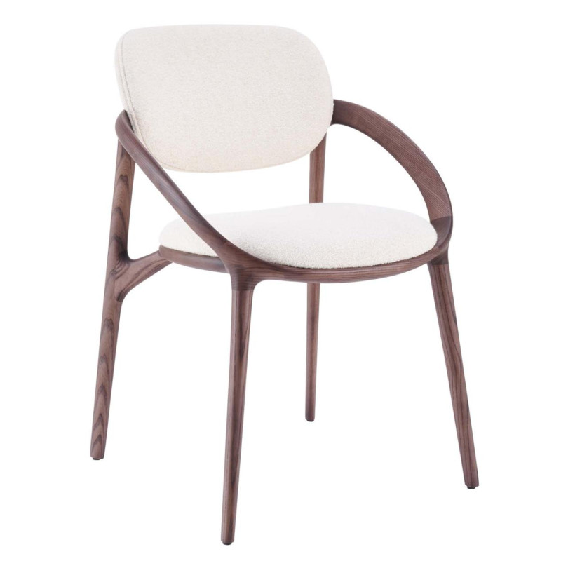 The MET-MET chair, a wooden chair with a curved, arched backrest and armrests. The chair has a light, cushioned seat made of a soft, cream-coloured fabric. The chair's design has a modern, stylish look with its clean lines and use of natural wood materials.