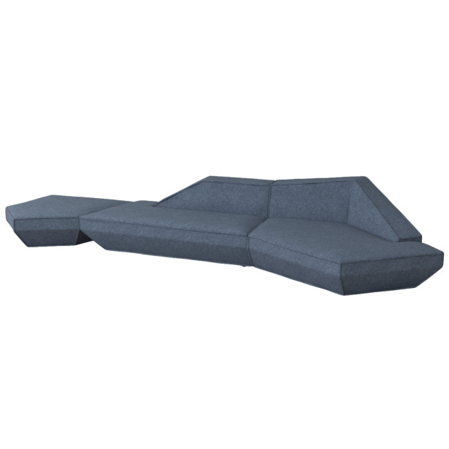 MOU-MOU modular sofa, as shown, a sectional sofa with a contemporary, minimalist design. It is upholstered in a blue fabric and features clean, angular lines with a low profile. The sofa is made up of multiple interlocking pieces, allowing for flexible arrangement. The sleek, geometric form and monochromatic colour give this sofa a refined, modern look that would work well in a variety of interior styles.