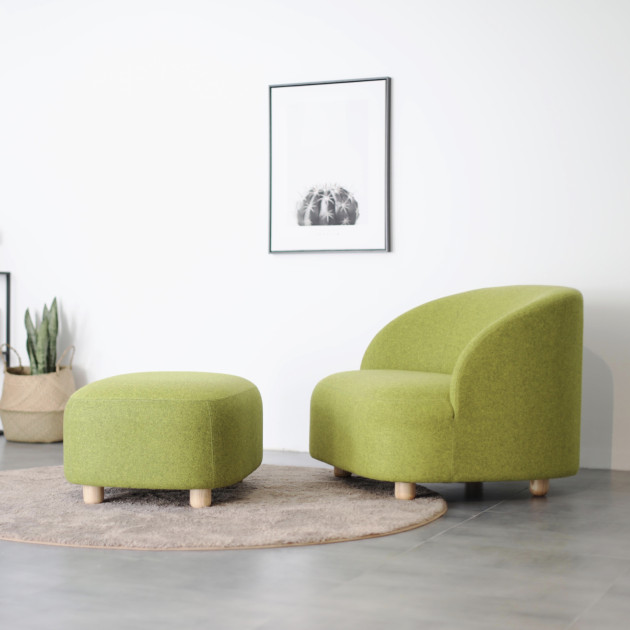 The BAR-BAR single seater sofa, as shown, it is clean and uncomplicated, upholstery in fabric. The backrest has a gently curved, low-profile shape, and the armrests are softly rounded. The legs are made in light-coloured solid ash wood. The overall aesthetic is understated and welcoming, making it well-suited for modern or minimalist interior spaces.