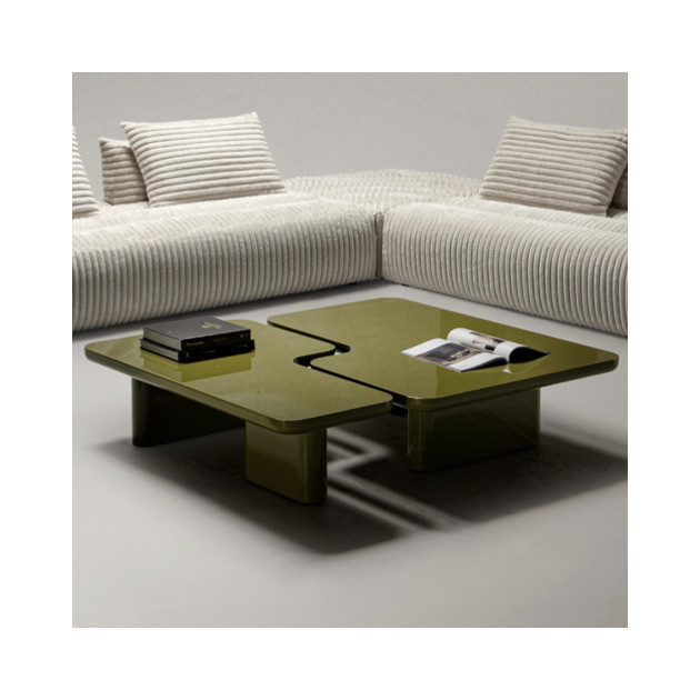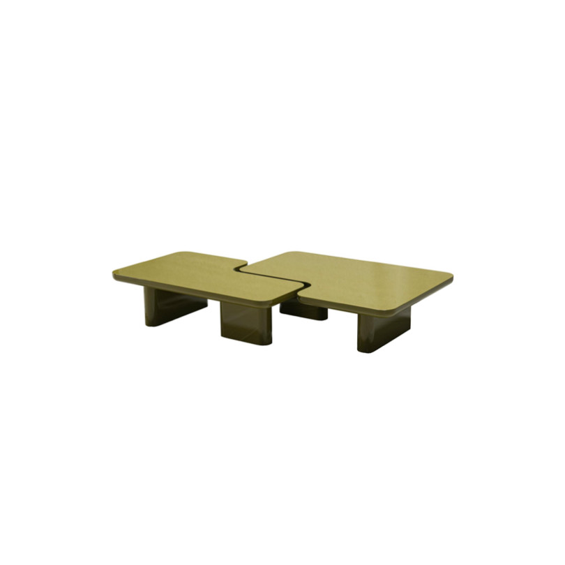 The MIX-MIX coffee table features a modern design with two interlocking surfaces for flexible arrangements. Its rich olive green colour adds elegance and works well with various decor styles, from minimalist to eclectic.