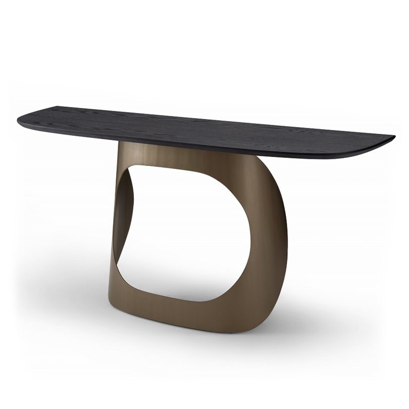 FUE-FUE Console Table, as shown, features a striking design with a sleek black wood top that exudes sophistication. The table is supported by a uniquely shaped, curved metal base, creating an eye-catching silhouette. Perfect for entryways or living spaces, this console table combines artistry with functionality, enhancing any contemporary décor.