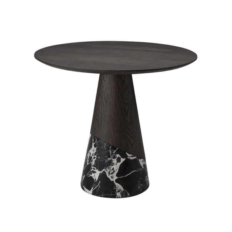 TEW-TEW Dining Table, as shown, features a beautifully crafted round top made from rich ash veneer, showcasing a deep, elegant finish that highlights its natural grain. This striking surface is supported by a unique conical base, elegantly wrapped in new Bulgari black matte marble, adorned with bold white veining that adds a touch of luxury. TEW-TEW Dining Table is a stunning marriage of modern artistry and functional design that elevates any dining experience.