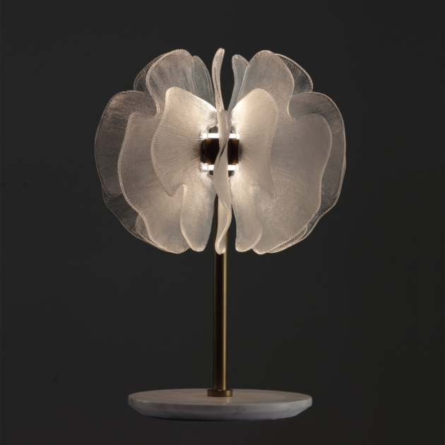 Flora Table Lamp, as shown, features its layered petals gracefully diffuse light, casting enchanting patterns. This lamp serves as a stunning focal point, bringing a sense of serenity and style to any room.
