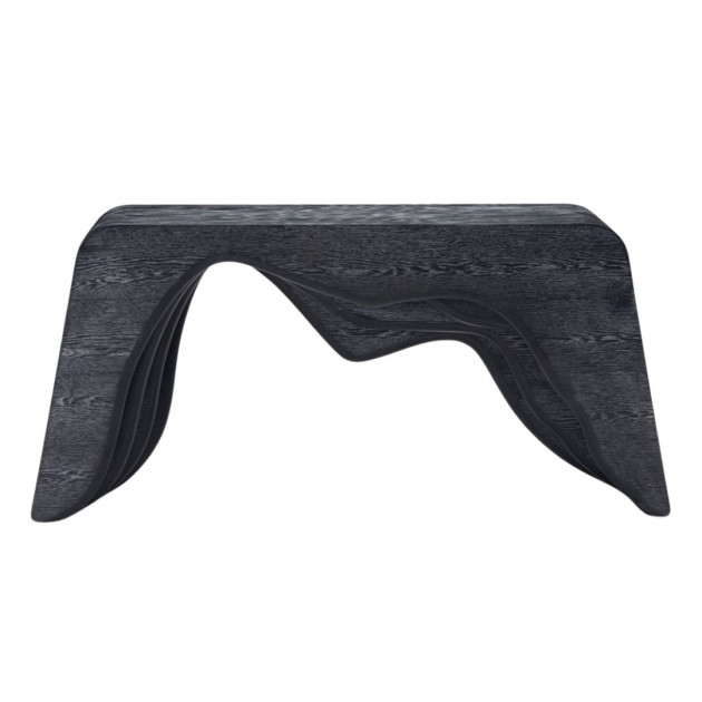 TRE-TRE Console Table, as shown, features a sculptural design that flows gracefully. Crafted from richly textured oak veneer, its undulating form adds dynamic beauty to any space. This unique piece is perfect for modern interiors, showcasing creativity in every curve.