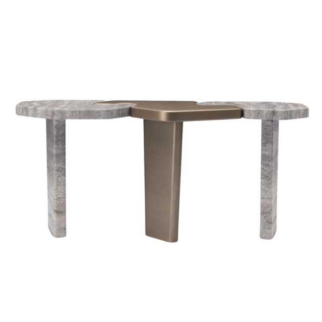 UZ-UZ Console Table, as shown, features unique marble tops with organic edges paired with a sleek central metal support. This striking design captures attention while offering functionality, making it an ideal statement piece for contemporary settings.