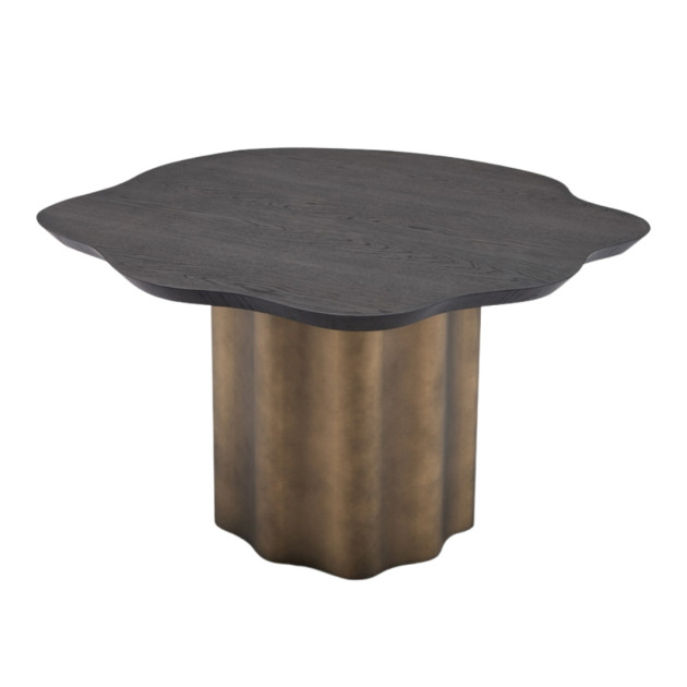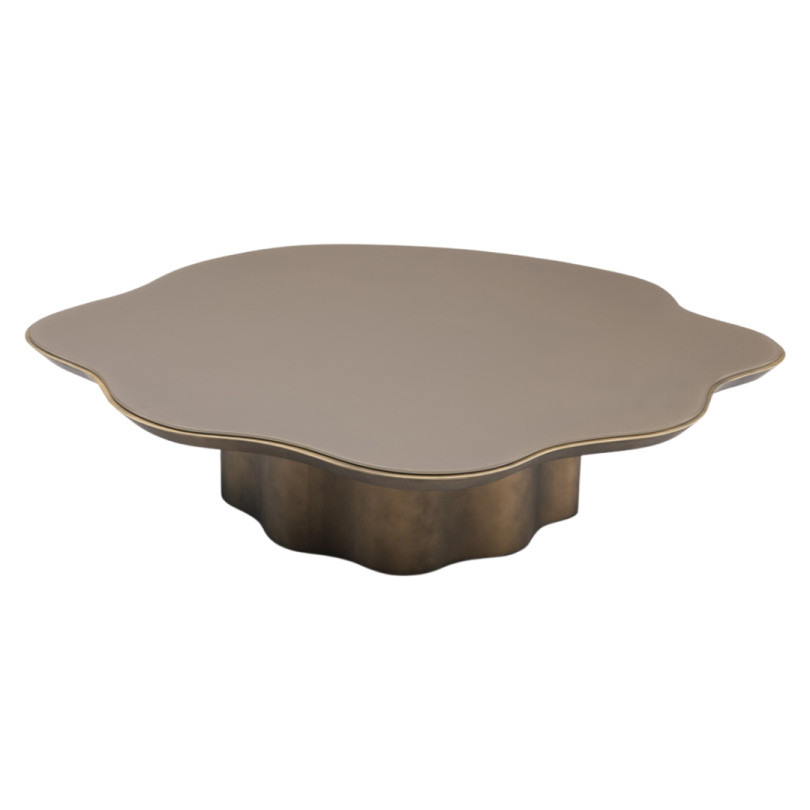 OUD-OUD Coffee table, as shown, features a beautifully crafted glass top with a unique, organic shape, paired with a stunning stainless steel base in a warm, brushed bronze finish. The product is available as a coffee table becoming nesting tables if you buy a set.
