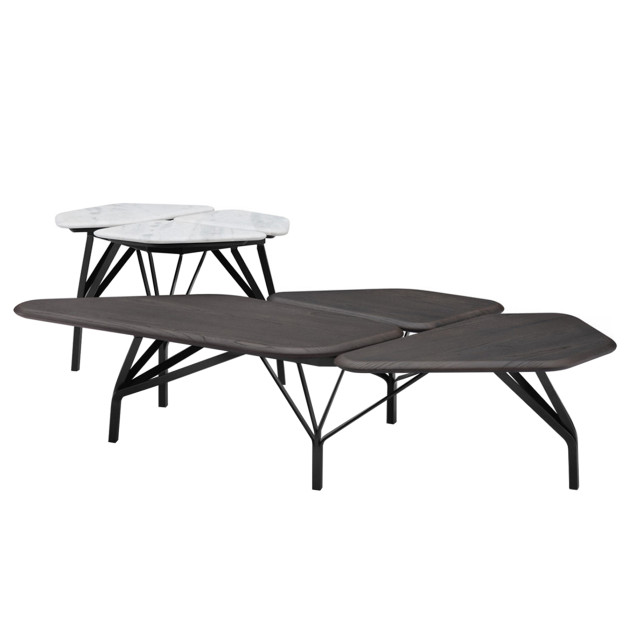 NES-NES Side Table, as shown, features a rich marble surface that seamlessly connects with a minimalist metal frame. Its striking interplay of geometric shapes and textures allow for versatile arrangements, enhancing any contemporary living space. The product is also available as a coffee table becoming nesting tables if you buy a set.
