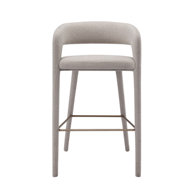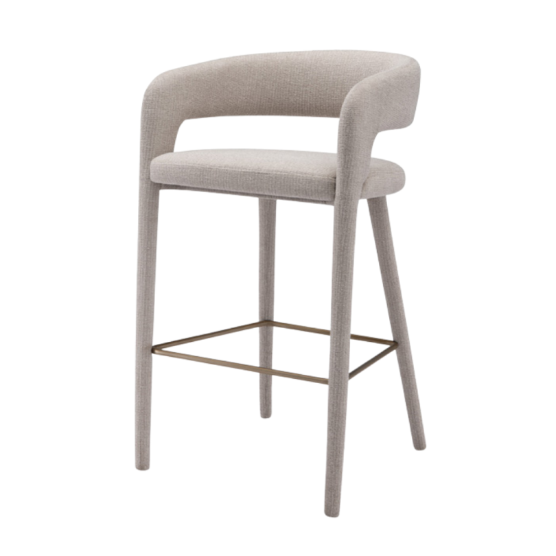 BOK-BOK Bar Stool, as shown, features a plush, upholstered seat with a gently curved backrest. Its elegant legs are complemented by a subtle metal footrest, creating a harmonious look that enhances modern interiors.