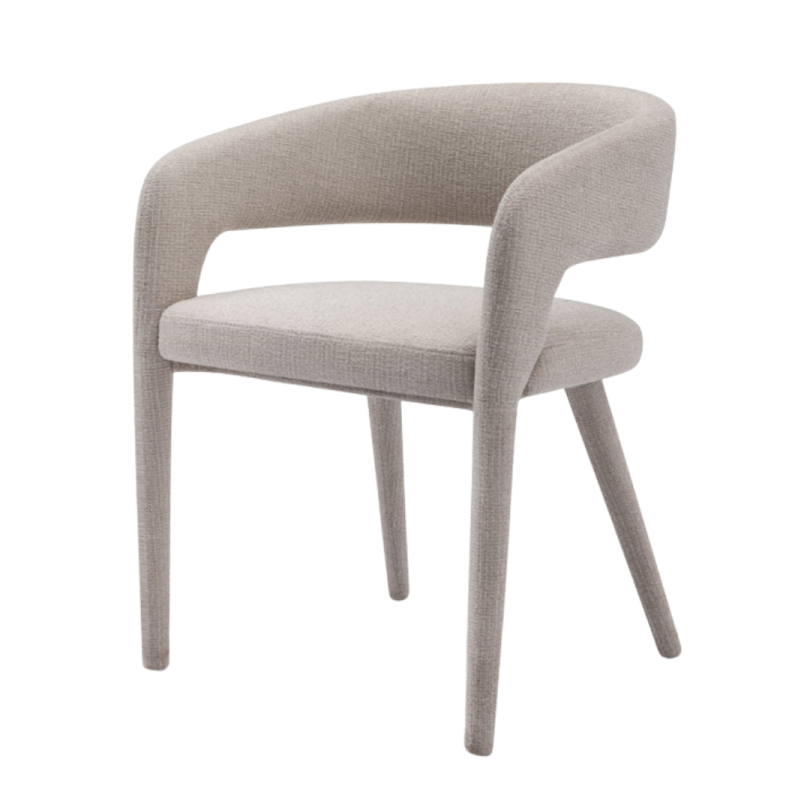 LIS-LIS Chair, as shown, features a seamless design that marries comfort and style with its soft, textured upholstery. The gracefully curved backrest and elegantly tapered legs create a harmonious silhouette, making it an ideal choice for modern dining areas or chic living spaces.