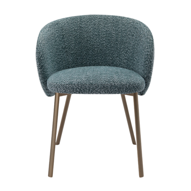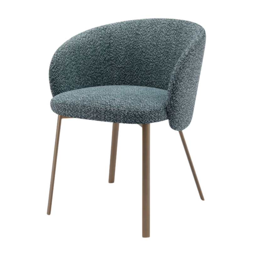 DUB-DUB Chair, as shown, features a soft, textured seat and a gracefully curved backrest. Its slender metal legs provide stability while adding a touch of elegance.