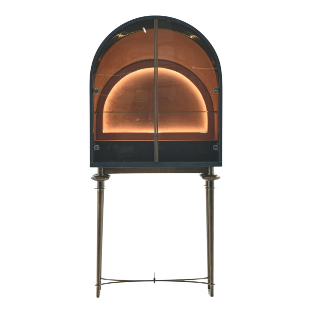 Black mother of pearl effect painted wood panel | Vibration stainless steel in copper colour leg frame | Tinted tempered glass door | Clear tempered glass shelf | Velvet fabric interior | LED Light strip