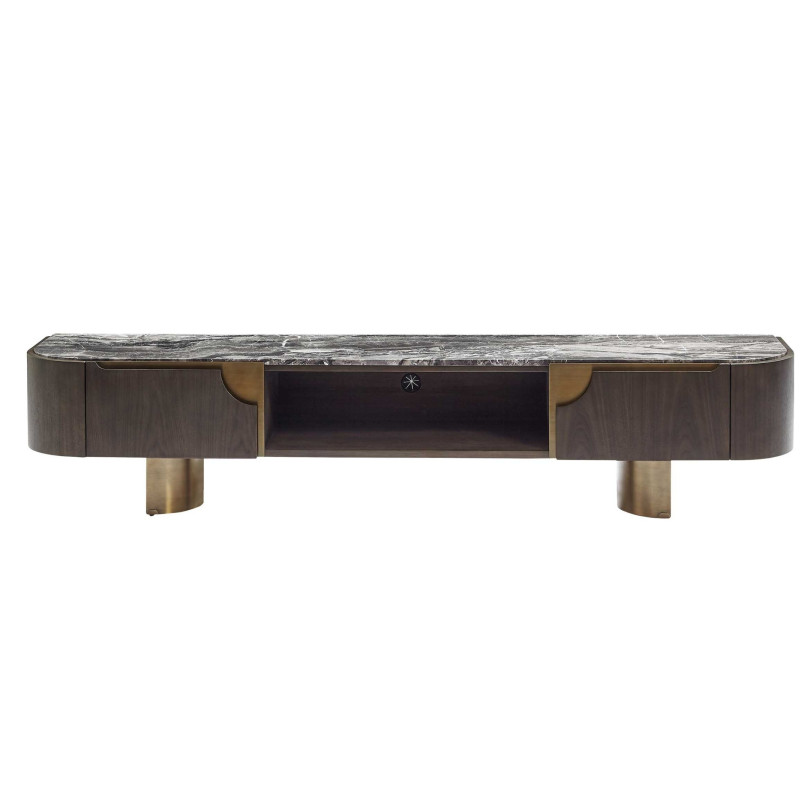 Natural marble top | Open grain black walnut veneer | Brushed brass finish stainless steel | Synthetic leather wrapped drawer base