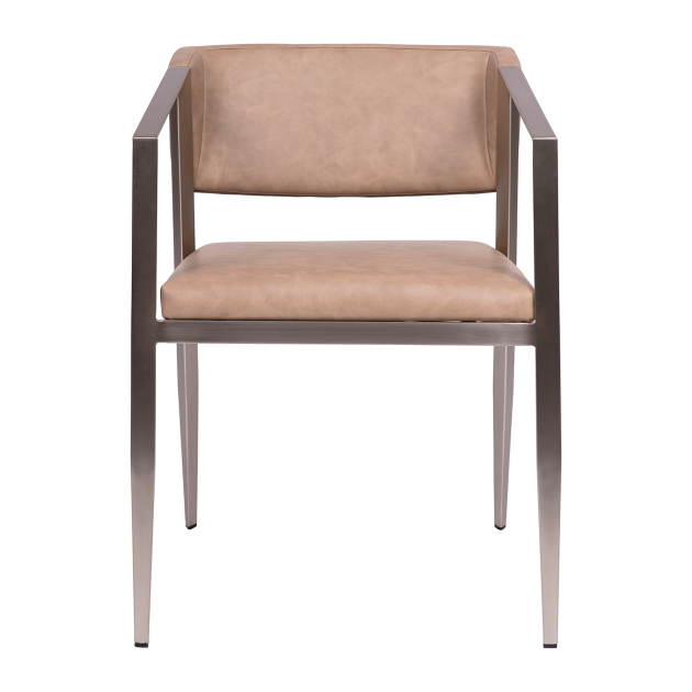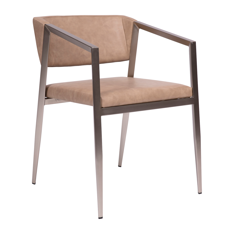 TOO-TOO Chair, as shown, silver colour stainless steel with brown top grain leather. Available in other colour and leather. Stainless steel leg frame also available in shiny gold finish.