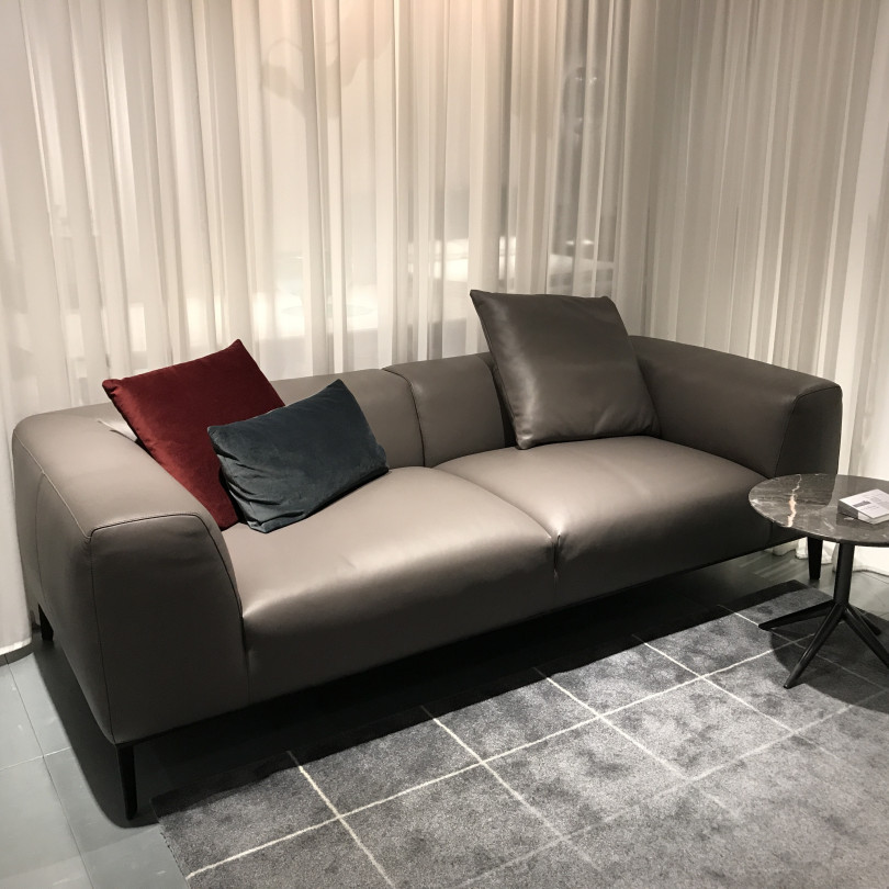 MIC-MIC three seater sofa, as shown, upholstered in dark grey top grain leather. A unified landscape with its parallel backrest and armrest, and simple lines that bring together the whole sofa.