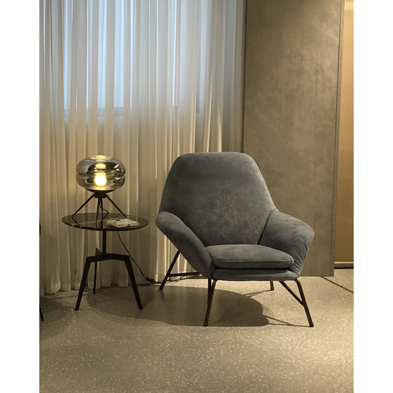 DE-DE lounge chair, as shown, a low lying and wide, stingray like lounge upholstery in fabric and polished gun metal stainless steel leg frame. Not only is it visually impressive, the seat cushion is topped with down feather for superior comfort.