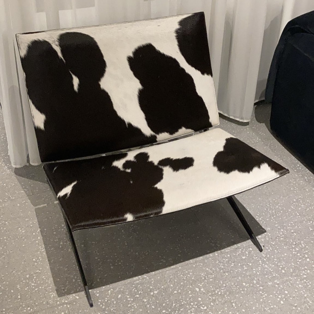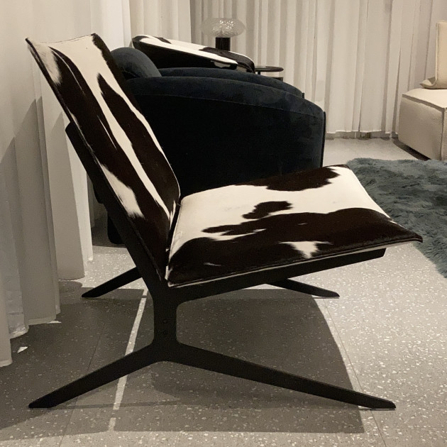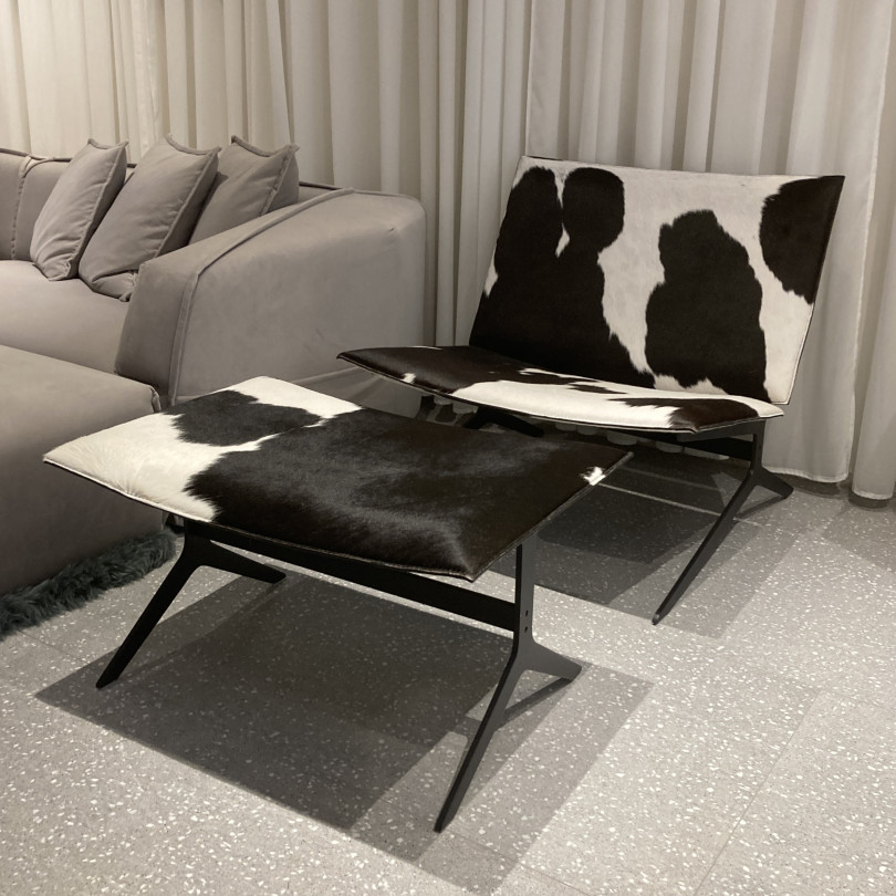 SENG-SENG Lounge Chair with Ottoman, as shown, features a structurally inspired linear design upholstered in a distinctive, natural cowhide. With its inherent contemporary silhouette, the lounge chair stands out in any context, and is an impeccable representation of today's modern living.