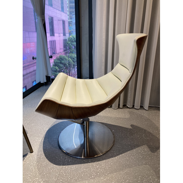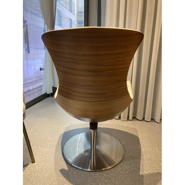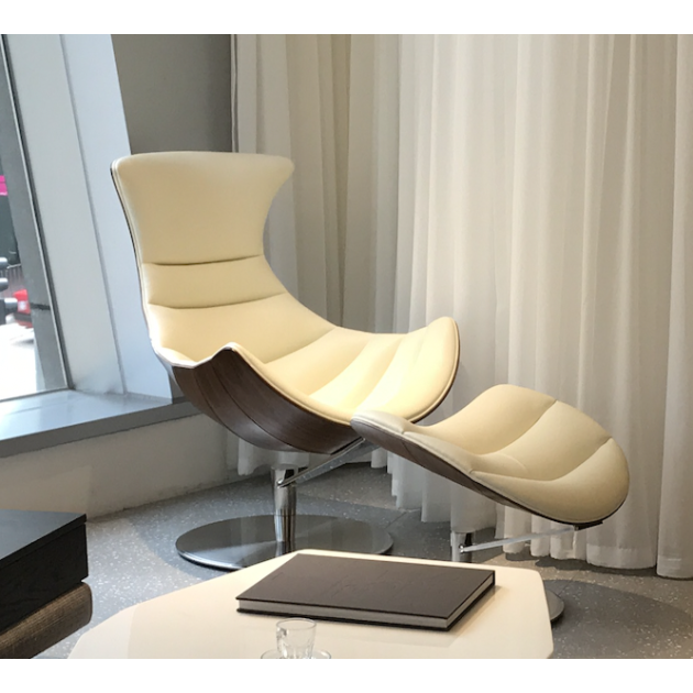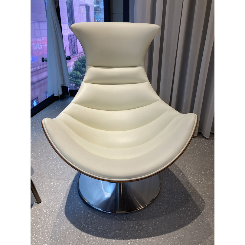 MOI-MOI lounge chair, as shown, beige top grain leather with a walnut veneer back and a stainless steel base.