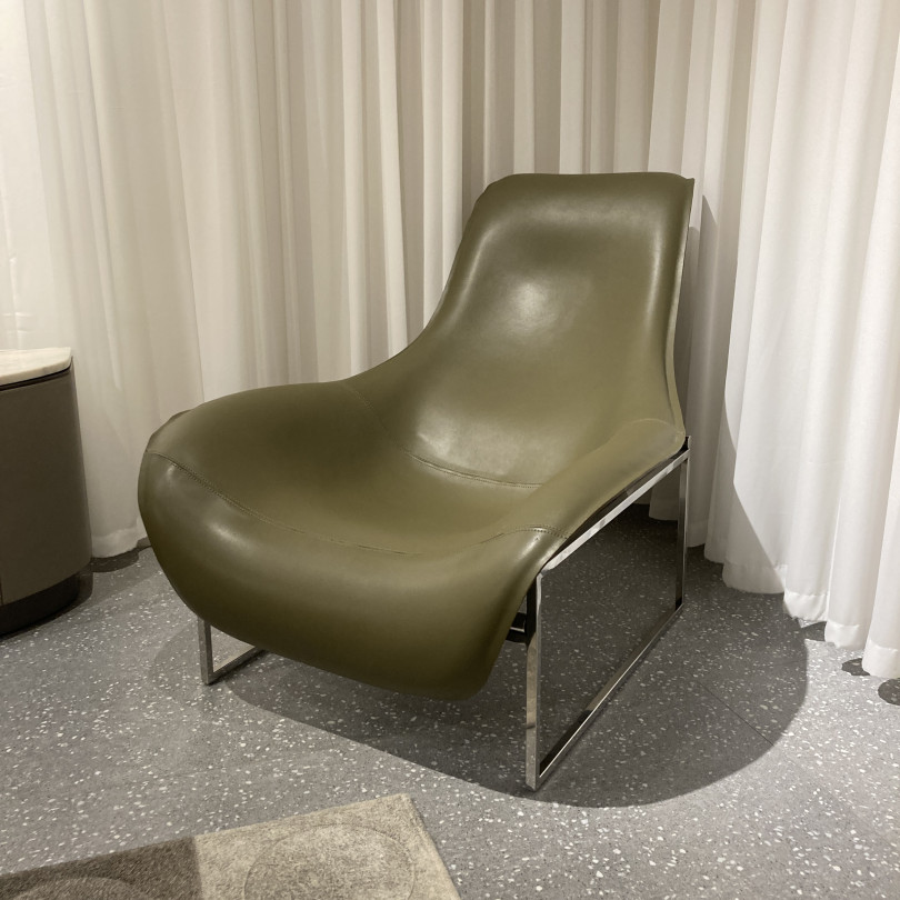 HOP-HOP lounge chair, as shown, Italian saddle leather with functional stainless steel frame. Curve shape tub like lounge chair allows you to rest in a stylish way. The seat shell can be upholstered in a large range of leather, which allows you to customise the chair for any interior.