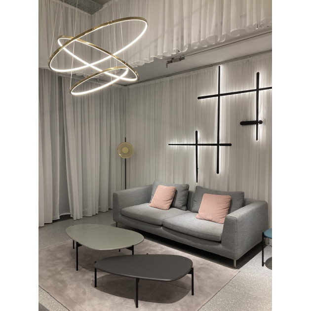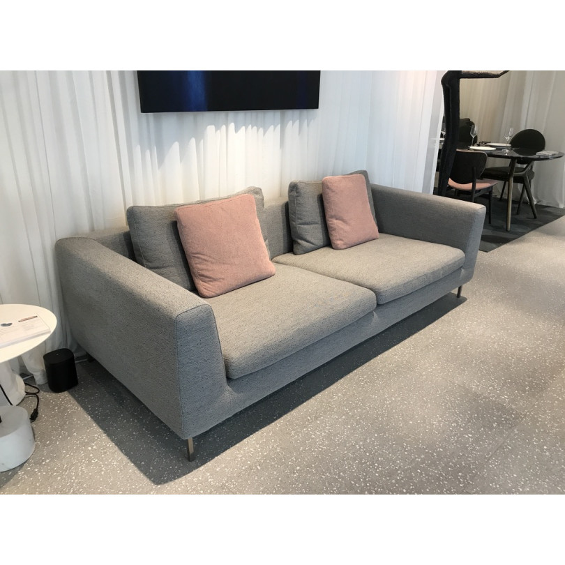 COM-COM three-seater sofa, as shown, grey fabric upholstery with silver stainless steel legs.