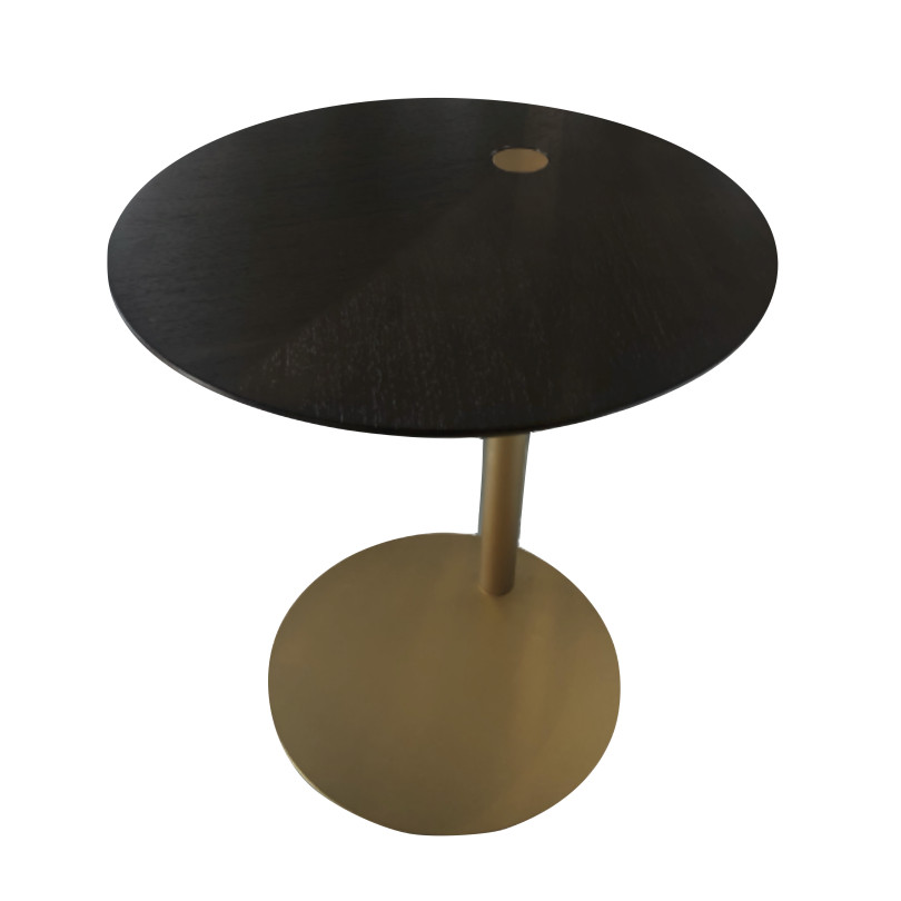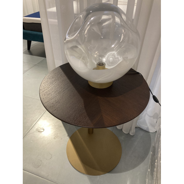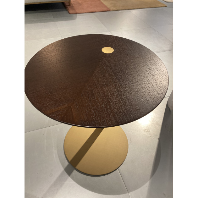 HIM-HIM side table, as shown, walnut wood veneer top and brushed brass metal base.