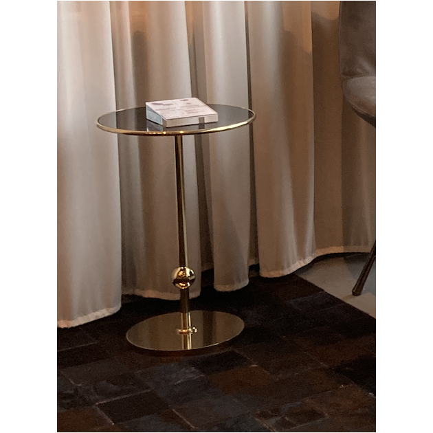 GU-GU side table, as shown, black glass top with a gold plated stainless steel stand.